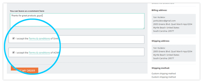 At checkout, customers must accept the terms and conditions of each vendor, whose products they are buying:
