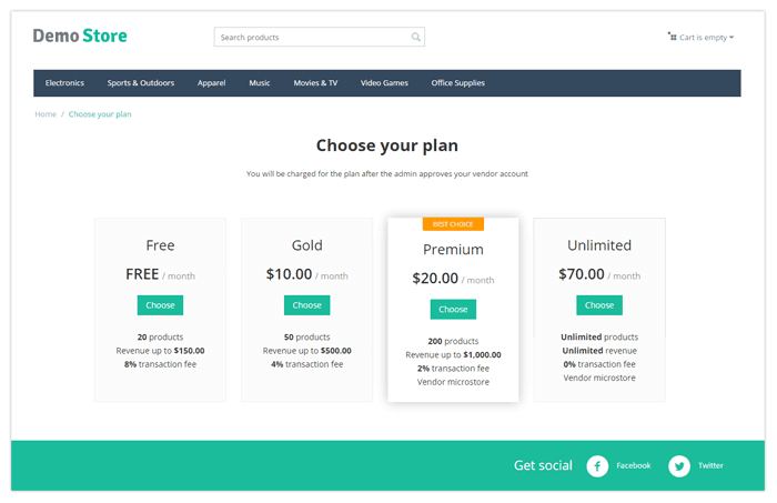 - Set the plan’s price, the period for which a vendor pays for the plan, and the transaction fee that you will charge for each order.