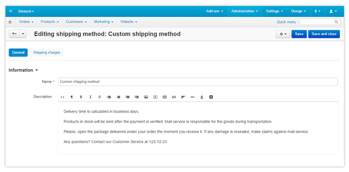 - The Description field for shipping methods—on a shipping editing page, you can enter descriptions for shipping methods, that customers will see at checkout: