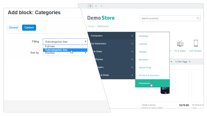 - Subcategory filling for the categories block—on a category page, customers only see subcategories of that category, not the full category tree.
