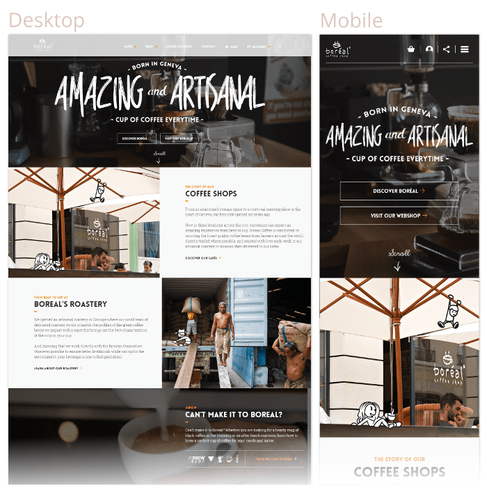 Boreal Coffee Shop is an online store and a promo website for a coffee shop chain of the same name across Geneva. On this website, you can buy first-rate coffee and order coffee catering for your events: conference, corporate off-site, or wedding.