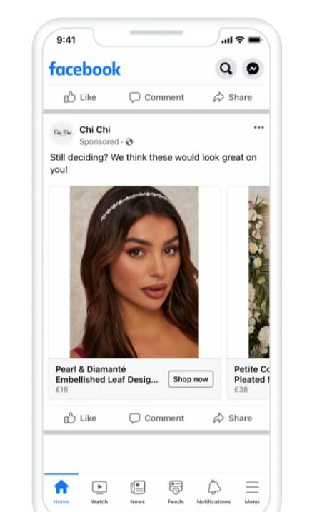Carousel Ads. This ad format helps businesses showcase up to ten videos or images. It offers the provision to add a unique headline, link, and description for each video. This format can be helpful when a brand wants to highlight a series of products. Notice the carousel ad by Chi Chi London. This campaign helped them achieve a 40% increase in sales.