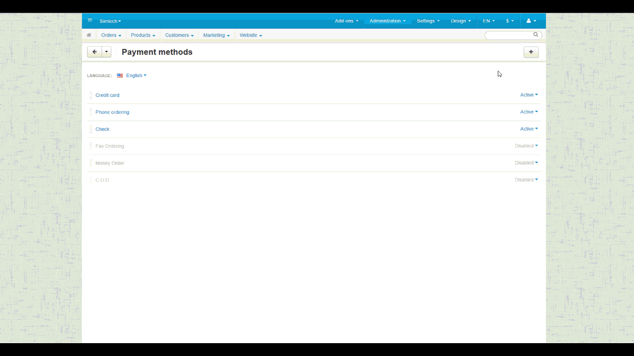 3. Creating the PayPal merchant account in the CS-Cart admin panel. To receive payments from your customers via PayPal, you need a merchant PayPal account. We’ve added an ability to register a merchant account right from the CS-Cart admin panel. No need to go to the PayPal website for that. To create a merchant account, go to Administration → Payment methods, and choose PayPal Express Checkout as a processor for you payment method. On the payment editing pop-up, switch to the Configure tab and click the large PayPal button.