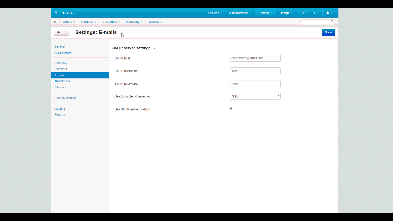 5. Ability to specify SMTP settings for each storefront. You can define the way CS-Cart sends email messages to customers and admins. One of the options is an external SMTP server. To connect to an SMTP server, you need to enter credentials. In CS-Cart 4.6.1, you can enter different SMTP credentials for different storefronts. Select the storefront at the top right, enter the credentials, and click Save.