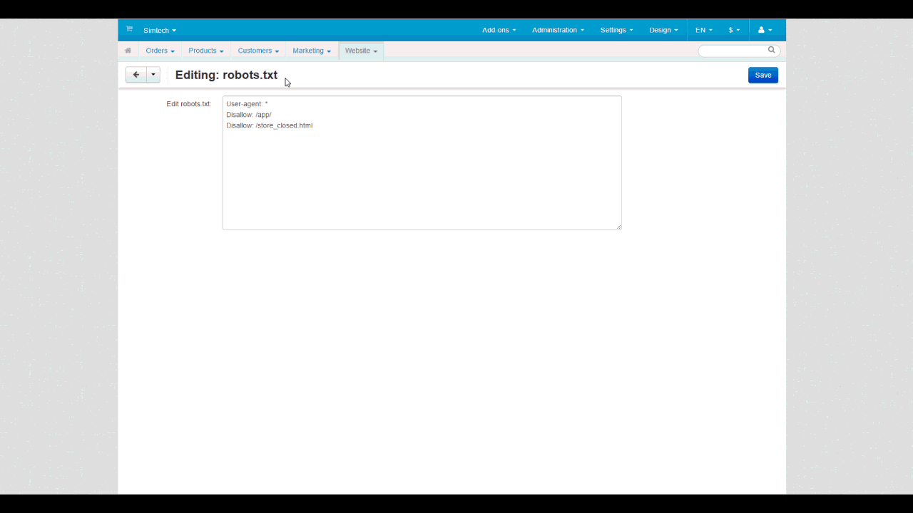 4. Ability to edit robots.txt for each storefront. The robots.txt file contains instructions for search robots. That way you can prevent them from indexing files with sensitive information and exposing that information. CS-Cart allows you to edit instructions for robots in the admin panel in Website → SEO → robots.txt. Previously, you had to enter FTP credentials and edit the actual file, and the instructions from that file applied to all storefronts. Now the instructions are stored in the database and can be different for each storefront.