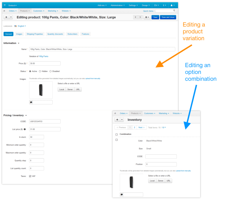 Option combinations look as separate products. Actually, they are not. Because of this, option combinations have limited settings and other inconveniences. For example, you cannot directly set a price for a certain combination, add multiple images, set shipping properties, and other things that you can do with a separate product.