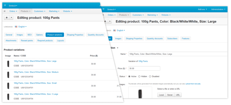 CS-Cart provides you with a flexible product option management. You can create as many options and their variants as you want, add them to products, and create option combinations.