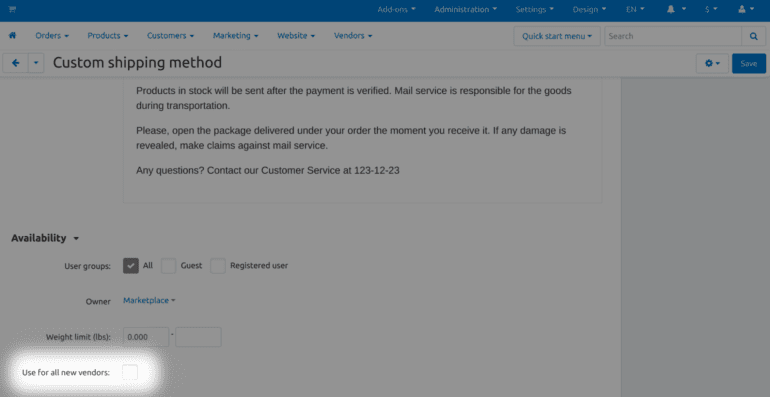 We try to cut down on tedious tasks such as this, so in version 4.14.1 we added the ability to make shipping methods available to new vendors automatically. This scenario is particularly useful if you don’t offer fulfillment and your vendors need to create their own shipping methods.
