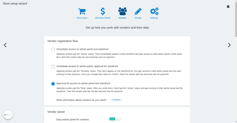 The “Vendors” tab of the marketplace setup wizard makes it easier to decide how your marketplace handles new vendors. There are three scenarios: