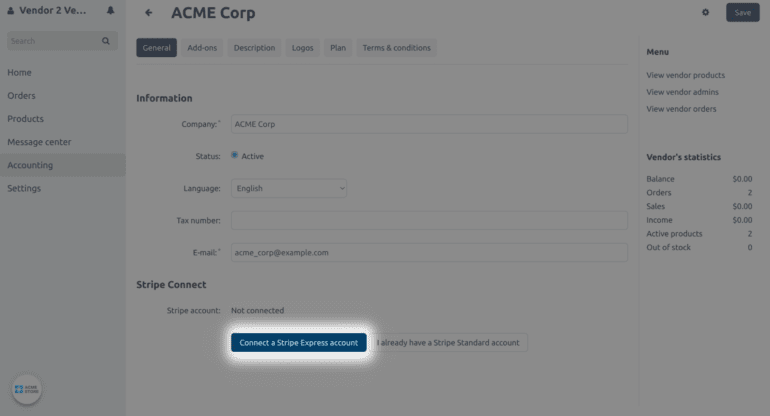 When you’re creating a Stripe Connect payment method, you can decide if you want to allow your vendors to connect Express accounts. Once the administrator sets up the Stripe Connect payment method, your vendors will be able to connect their Express accounts on the vendor info page.