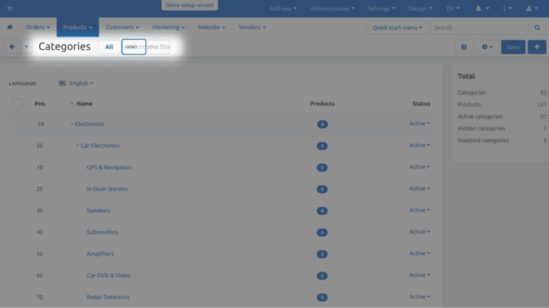 Now you can decide if you want to show the category on all of your storefronts, or just on a particular one. You can do it on the category editing page. A storefront switch appears on the list of categories. It allows you to see which storefront the category belongs to.