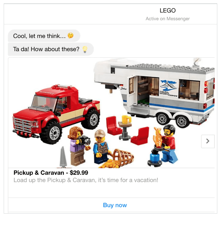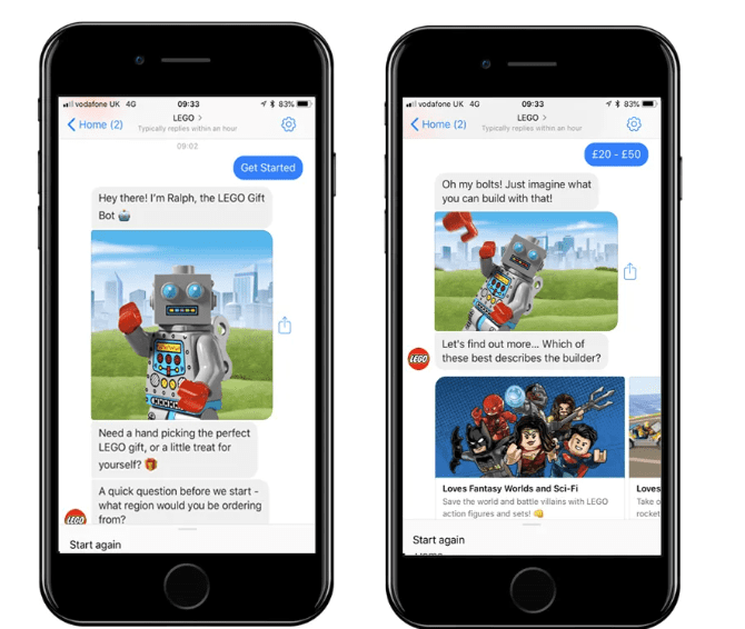 Another brand that’s made huge strides by chatbot marketing is Lego. The chatbot – Ralph – suggests gift options based on how a user answers questions relating to key data such as location, age, and gift budget.